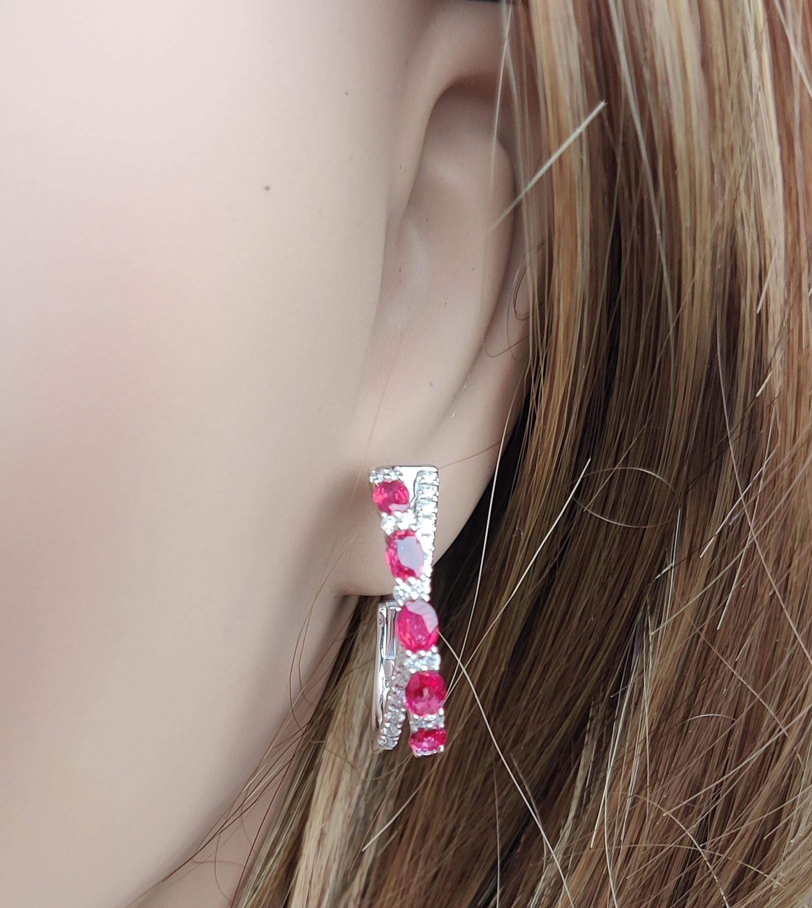 Natural Red Oval Ruby and White Diamond 3.20 Carat TW Gold Hoop Earrings