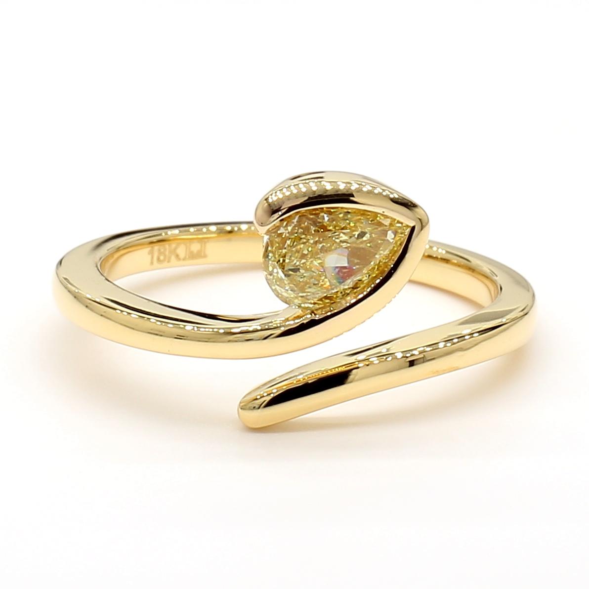 RareGemWorld's beautiful diamond ring. Mounted in a beautiful 18K Yellow Gold setting with a natural pear cut yellow diamond. This ring is guaranteed to impress and enhance your personal collection!