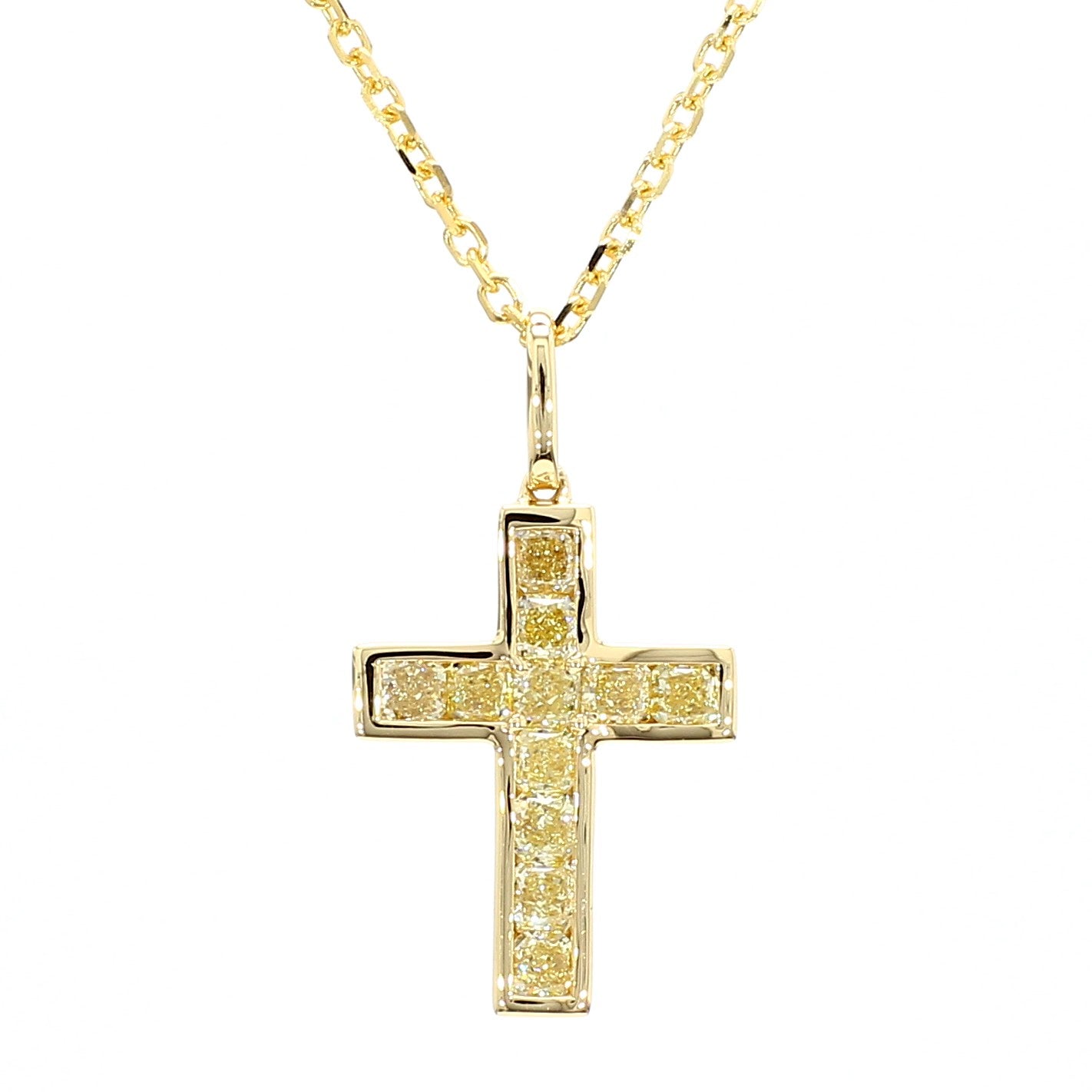 RareGemWorld's beautiful diamond pendant. Mounted in a beautiful 18K Yellow Gold setting with natural radiant cut yellow diamonds in a beautiful cross format. This pendant is guaranteed to impress and enhance your personal collection!
